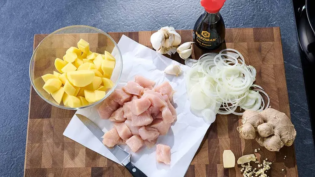 400 g Kuřecích prsou – 400 g brambor – 1 cibule – 1 kus zázvoru (cca 2 cm) – 1 stroužek česneku