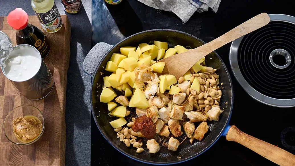 Na rozehřátém Kikkoman Praženém sezamovém oleji orestujte kuřecí maso. Přidejte cibuli, zázvor a česnek a krátce restujte. Poté přidejte brambory, arašídy a kari pastu, promíchejte a zalijte kokosovým mlékem.