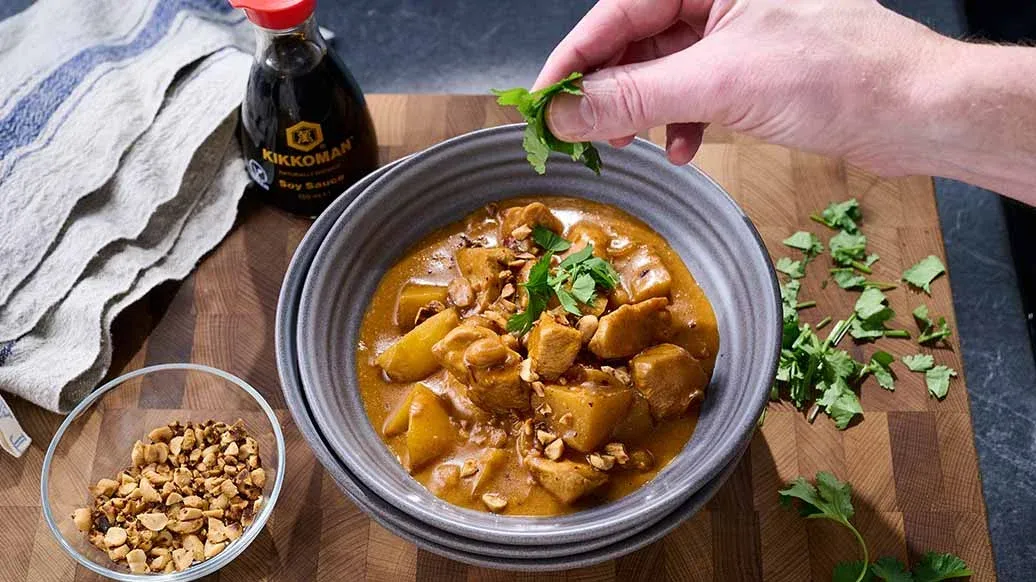 Krémové thajské Massaman kari s jemným kuřecím masem, bohatým kokosovým mlékem a měkkými bramborami, doplněné praženými arašídy, čerstvým koriandrem a umami nádechem Massaman kari pasty a Kikkoman Ponzu citron.