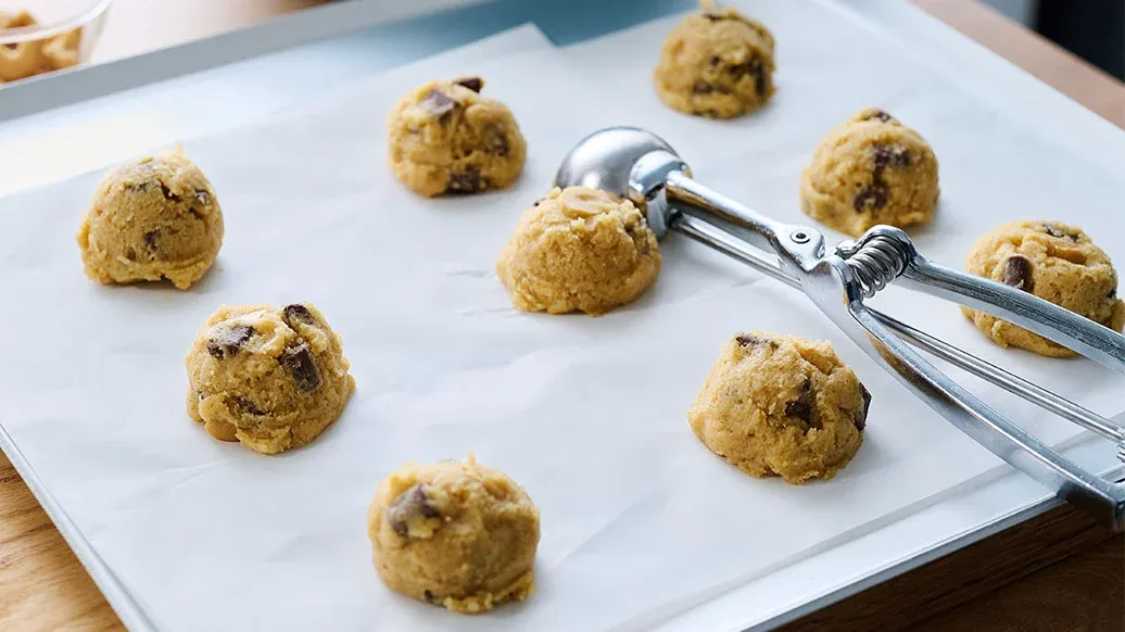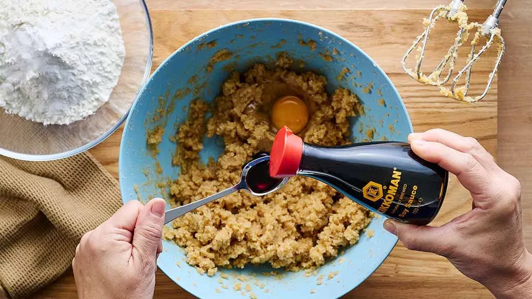 Předehřejte troubu na 180 °C a vyložte 2 plechy papírem na pečení. Smíchejte mouku, kukuřičný škrob a jedlou sodu. Máslo s oběma cukry šlehejte 2–3 minuty. Přidej vanilkovou pastu, Kikkoman Sójovou omáčku a vejce a dobře promíchejte.