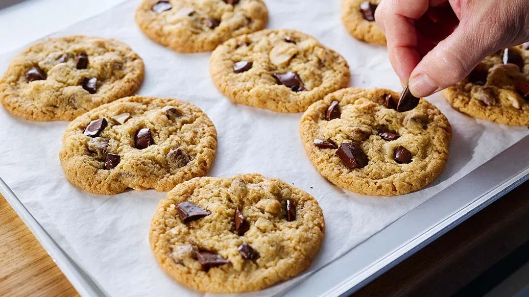 Jakmile sušenky vyndáte z trouby, jemně do nich vmáčkněte pár dalších čokoládových kousků. Nechte vychladnout na mřížce.