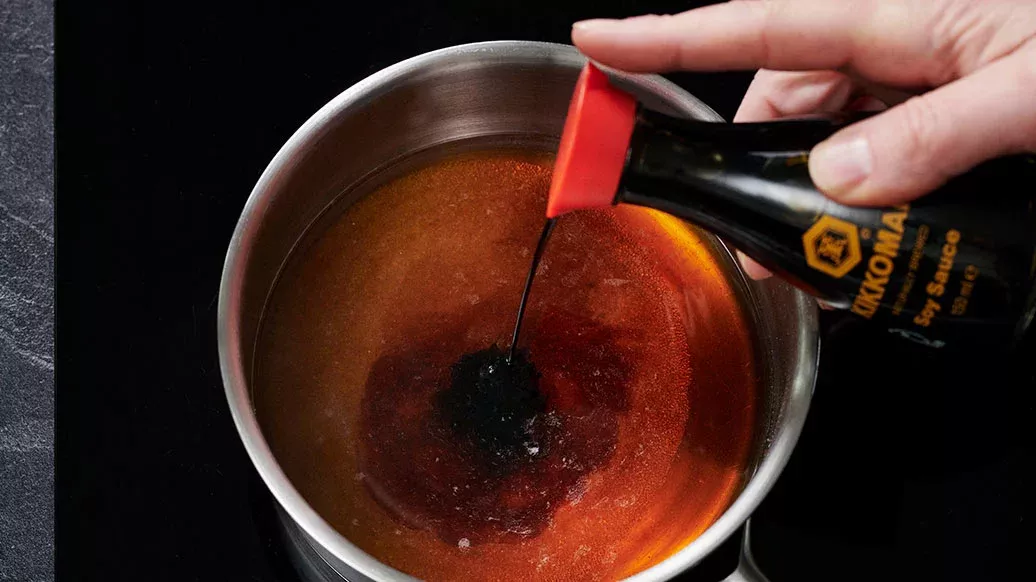 Do hrnce dejte bílé víno a přiveďte k varu. Přidejte minerální vodu, cukr a Kikkoman Sójovou omáčku a pokračujte ve vaření, dokud se cukr nerozpustí.
