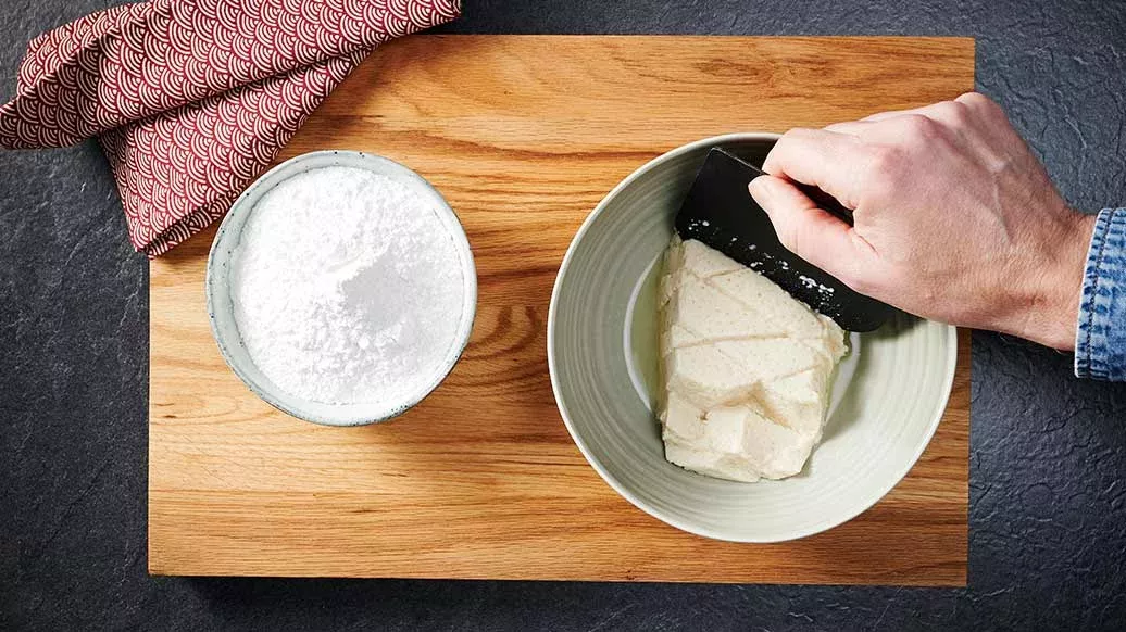 Důkladně sceďte tofu, vložte je do mísy a dobře rozmačkejte stěrkou