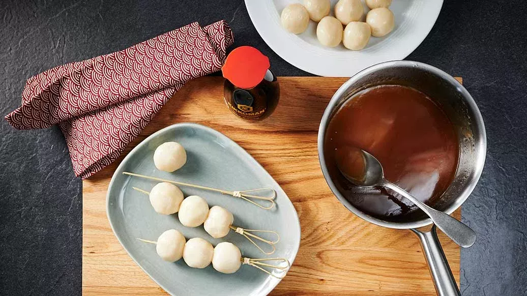 Metody a ingredience na mochi kuličky se sladkou sójovou omáčkou. Velmi populární japonský dezert.