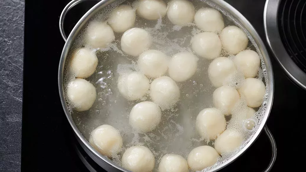 V hrnci přiveďte k varu dostatek vody a vařte knedlíčky z rýžové mouky 3–4 minuty. Snižte teplotu a vařte kuličky, dokud nevyplavou na povrch.
