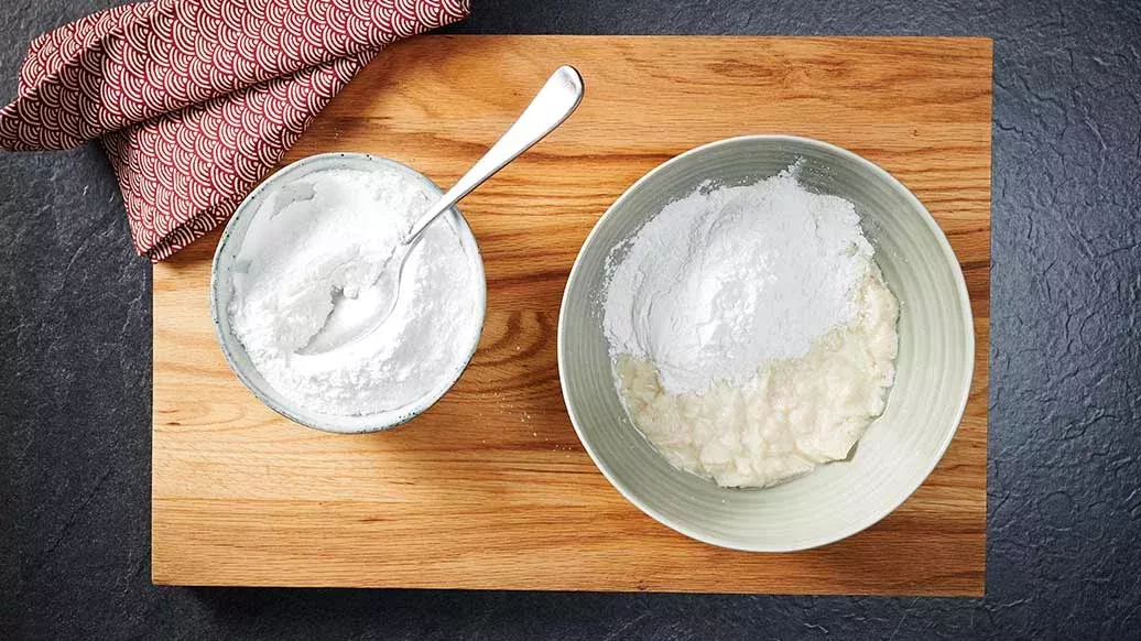 Přidejte lepivou rýžovou mouku a rukama důkladně vypracujte těsto, až bude hladké.