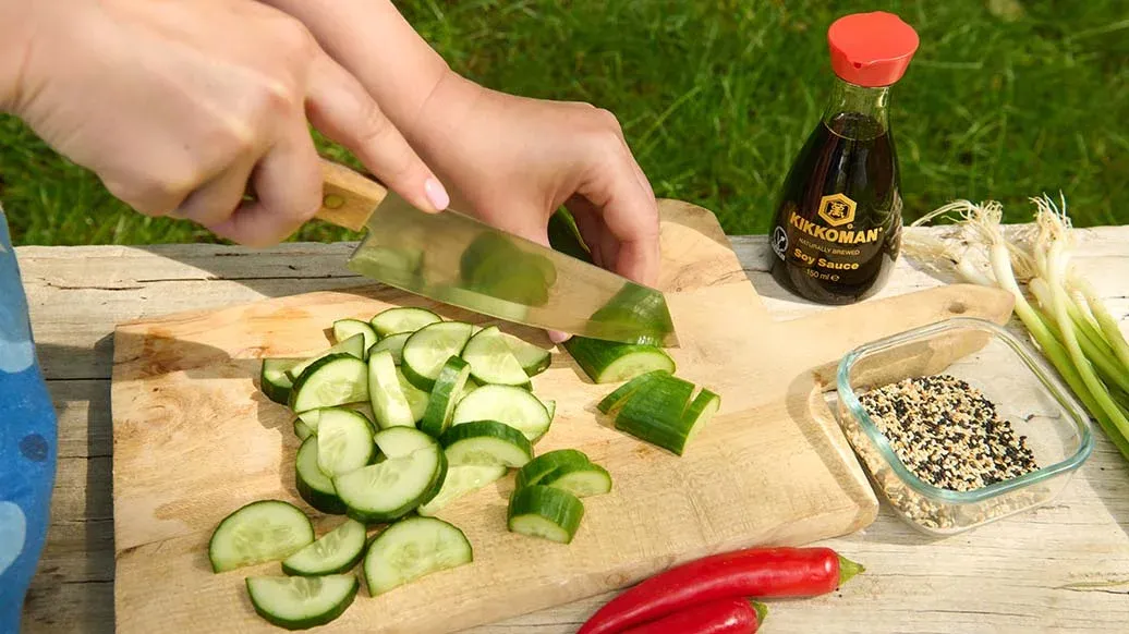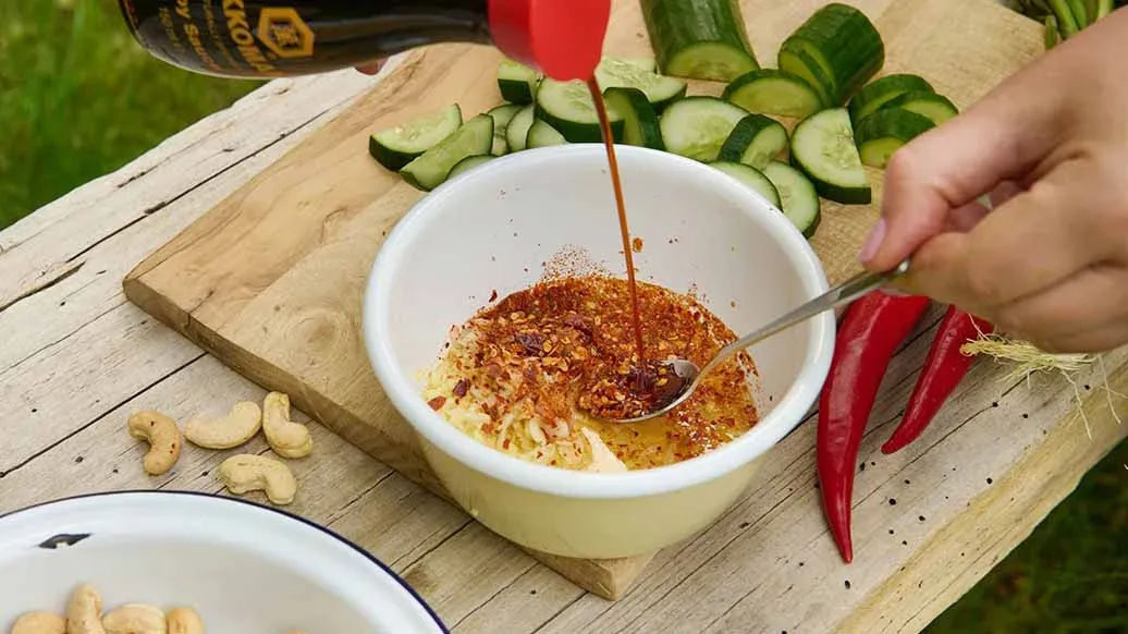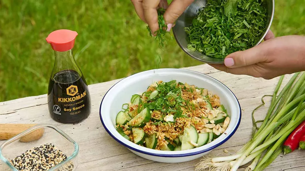 Osvěžující okurkový salát s křupavými oříšky, pikantním chilli a výraznou chutí Kikkoman Sójové omáčky. Na závěr je posypán praženou cibulkou pro ještě intenzivnější chuť a texturu.