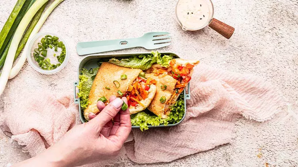 Jarní cibulku nasekejte. Omelety přeložte napůl a uložte do svačinových boxů. Podávejte s mayo-sriracha omáčkou a posypané jarní cibulkou.