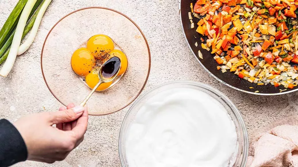 Dopřejte si výraznou explozi chutí k obědu s touto lehkou a nadýchanou zeleninovou omeletou, provoněnou bohatou sójovou chutí.
