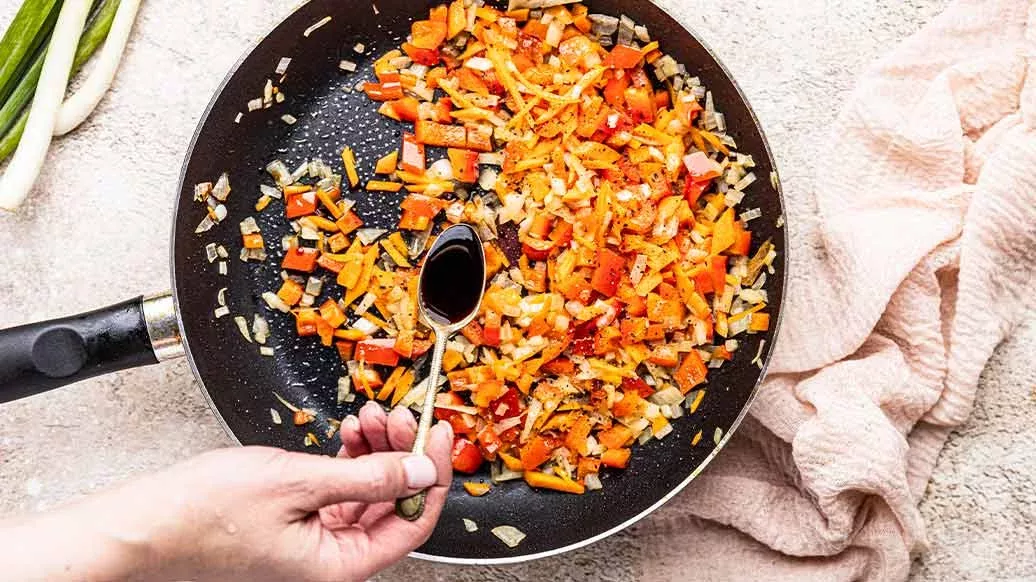 Mrkev a červenou papriku nakrájejte na tenké proužky, cibuli a jarní cibulku nasekejte. Na oleji osmahněte cibuli dozlatova, poté přidejte mrkev a papriku. Přidejte pepř a Kikkoman Sójovou omáčku. Nakonec posypte jarní cibulkou a odložte stranou.