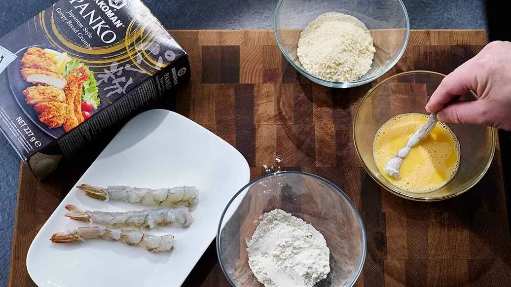 Vejce rozšlehejte. Každou krevetu nejprve obalte v mouce, poté v rozšlehaném vejci a nakonec ve strouhance Kikkoman Panko. Smažte ve vyšší vrstvě rozpáleného oleje dozlatova. Hotové krevety krátce naložte do omáčky z kroku 1 – přibližně na 2 minuty.