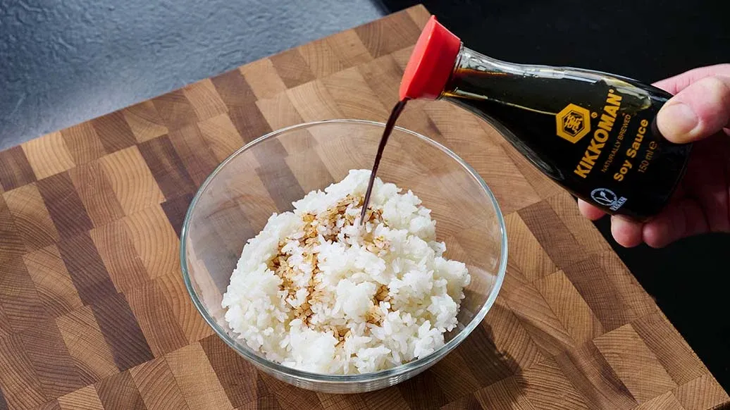 Rýži vložte do misky, promíchejte ji s Kikkoman Sójovou omáčkou a rozdělte na 4 stejné porce.