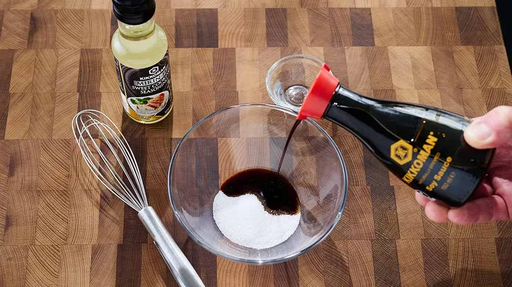 Smíchejte Kikkoman Sladké mirin dochucovadlo, Kikkoman Sójovou omáčku, cukr a 2 lžíce vody – vznikne sladko-slaná marináda. Krevety osušte papírovou utěrkou. Na spodní straně (břiše) každé krevety udělejte 4–5 mělkých zářezů (cca 5 mm hlubokých), aby se při smažení nekroutily. Položte je na pracovní plochu hřbetem nahoru, lehce přitlačte a případně znovu osušte.