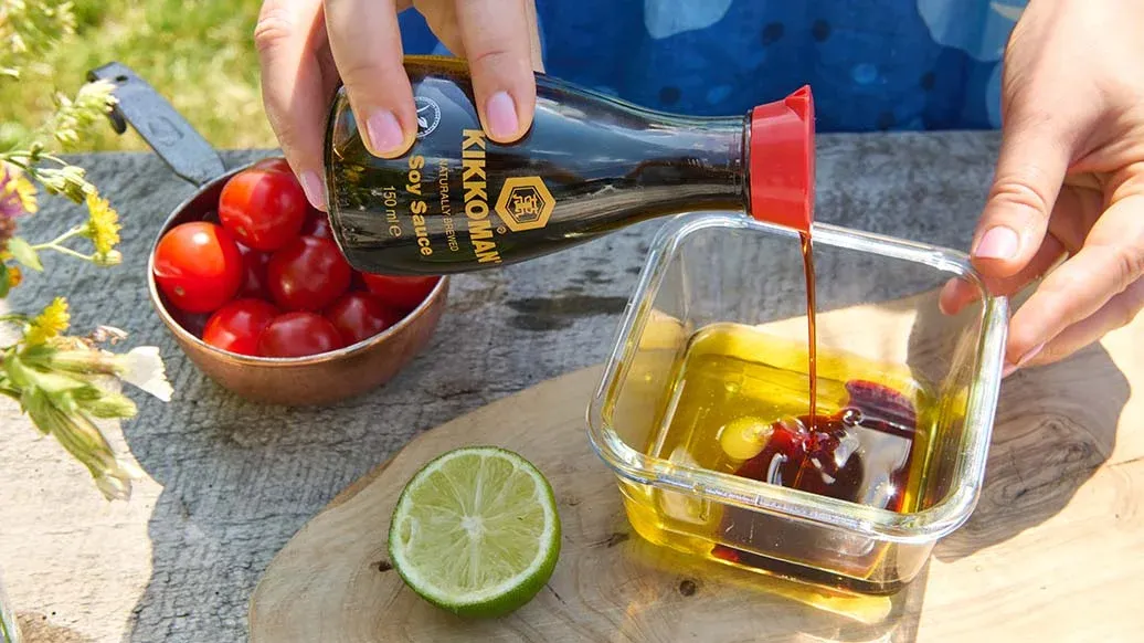 2 polévkové lžíce čerstvé limetkové šťávy – 2 polévkové lžíce olivového oleje – 2 polévkové lžíce Kikkoman Sójová omáčka přirozeně fermentovaná tekuté ochucovadlo – 1 polévková lžíce medu