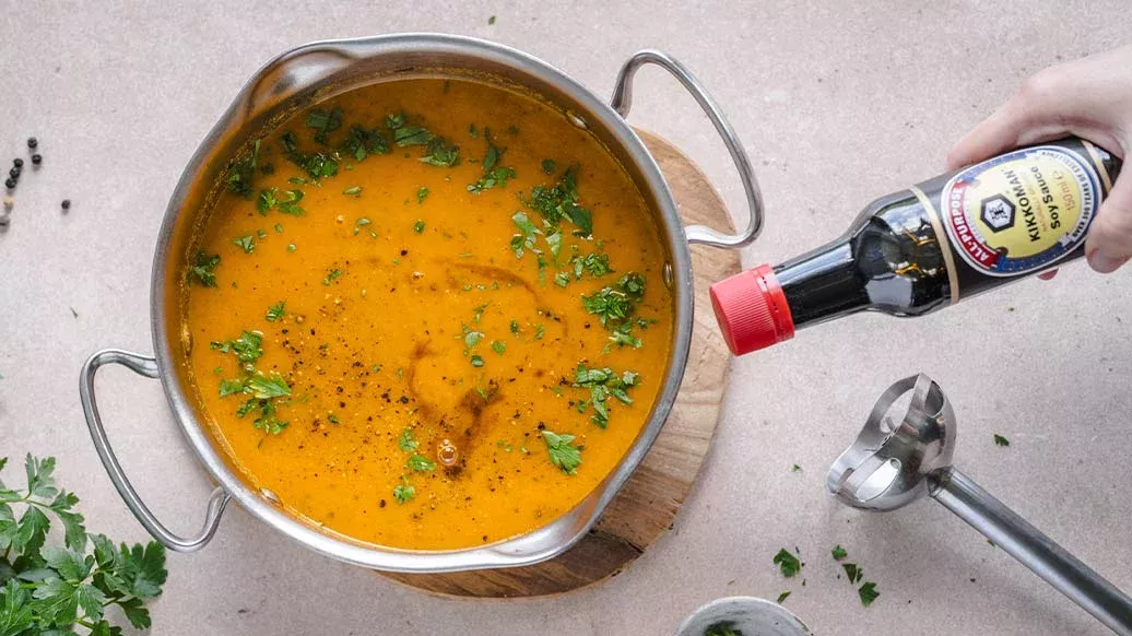 Pečenou zeleninu přendejte do hrnce, zalijte vývarem a vařte 15 minut. Rozmixujte tyčovým mixérem, dochuťte Kikkoman Sójovou omáčkou, pepřem a petrželkou. Podávejte s jáhlami.
