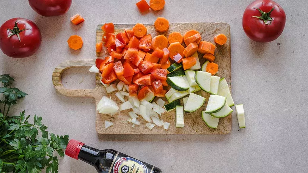 2 mrkve – ½ cukety – 3 rajčata – 1 červená paprika – ½ velké cibule – 2 polévkové lžíce olivového oleje – 2 polévkové lžíce nasekané petržele