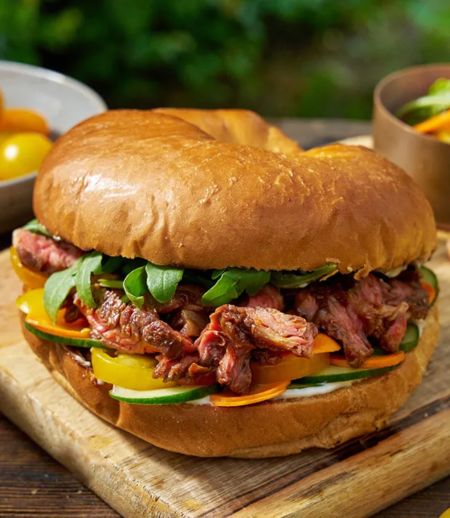 Rozkrojte housky na poloviny a lehce ogrilujte. Namažte majonézu na spodní poloviny, poté vrstvěte s plátky hovězího masa, rukolou, rajčaty a nakládanou okurkou a mrkví. Zavřete sendviče a podávejte teplé nebo studené.