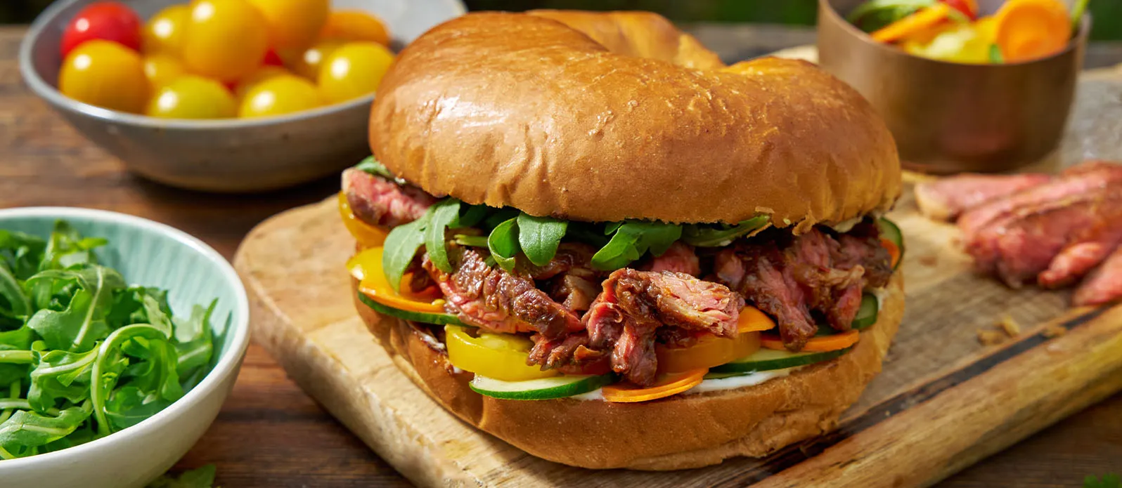 Šťavnaté marinované hovězí v Kikkoman Kimchi chili omáčce, podávané v briošce s křupavými okurkami, rajčaty a rukolou.