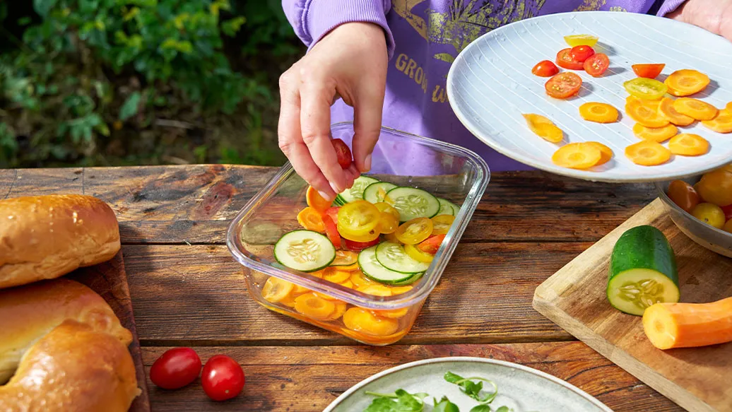 Nakrájejte okurku a oloupanou mrkev na tenké plátky a cherry rajčata překrojte na poloviny. Poté smíchejte s octem a medem a nechte marinovat alespoň 15 minut.