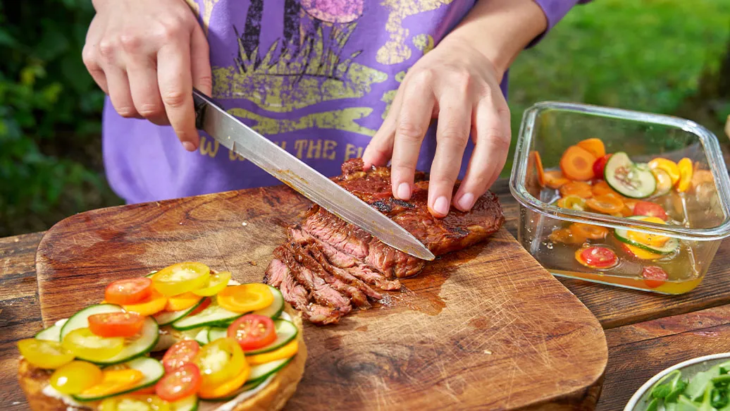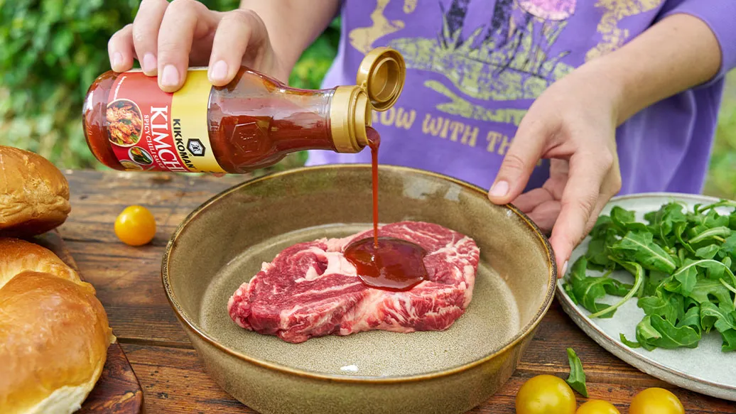Marinujte hovězí maso v Kikkoman Kimchi pikantní chili omáčce po dobu 15 minut, poté smažte nebo grilujte 3–4 minuty z každé strany. Nakrájejte hovězí maso na tenké plátky.