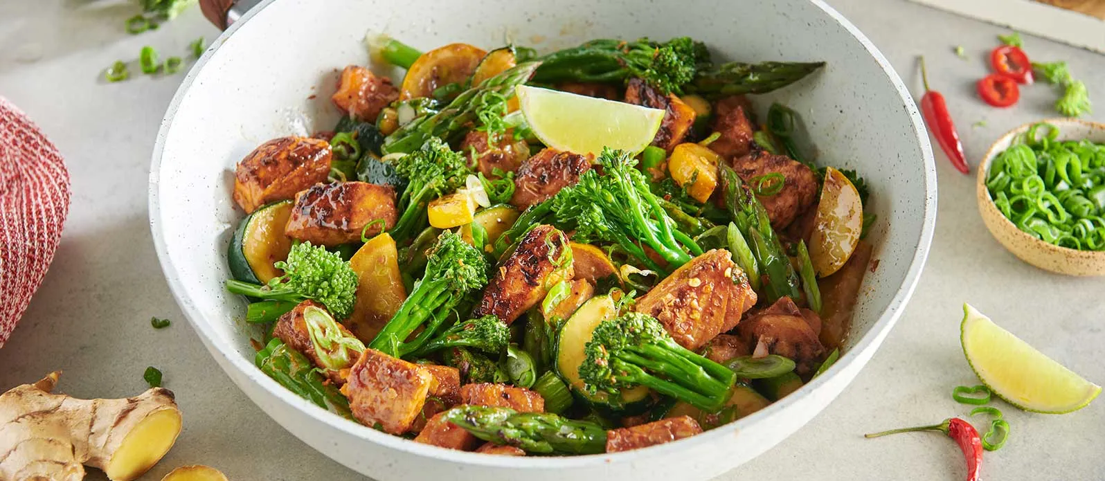 Tento pokrm s rybou inspirovaný Blízkým východem spojuje jemnou chuť lososa s pikantním nádechem chilli. Křupavý chřest, brokolice a cuketa dodávají jídlu svěží strukturu a šťavnatost.