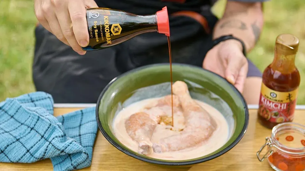 2 kuřecí stehýnka – 150 ml podmáslí – 2 stroužky česneku, nakrájené – 1 čajová lžička mleté uzené papriky – 2 polévkové lžíce Kikkoman Kimchi pikantní chili omáčka – 2 polévkové lžíce Kikkoman Sójová omáčka přirozeně fermentovaná tekuté ochucovadlo – 1 polévková lžíce olivového oleje