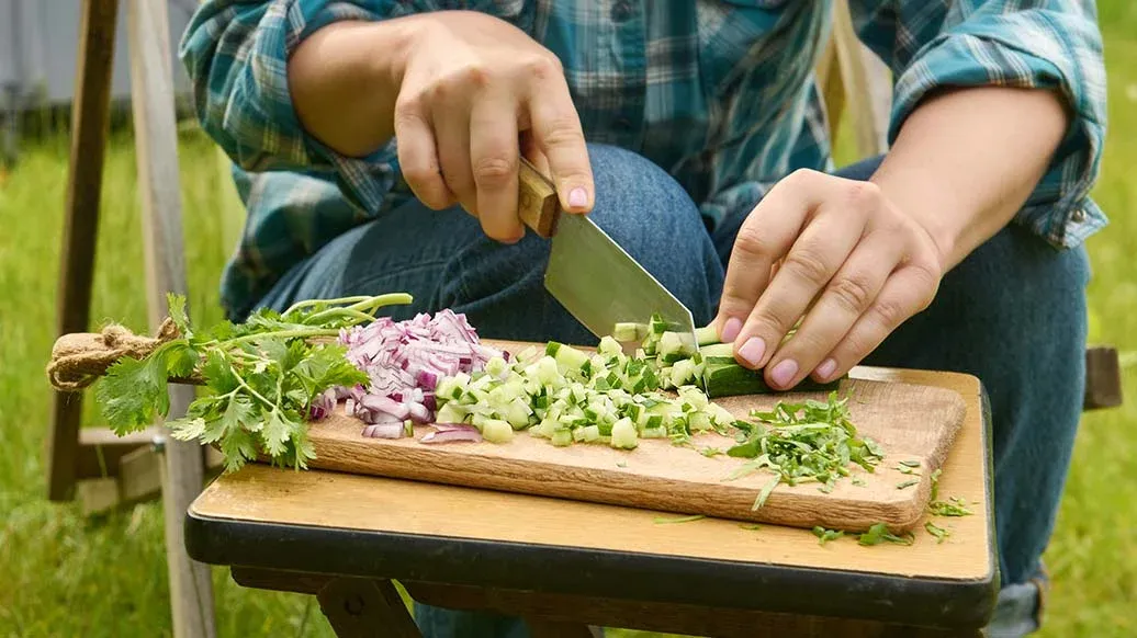 200 g barevné quinoi – 1 velká zelená okurka – 1 červená cibule – 1 chilli paprička – 2 červená rajčata – ½ svazku petrželky – ½ svazku máty – ½ svazku koriandru – 3 polévkové lžíce Kikkoman Citrónová ponzu omáčka – 4 polévkové lžíce olivového oleje