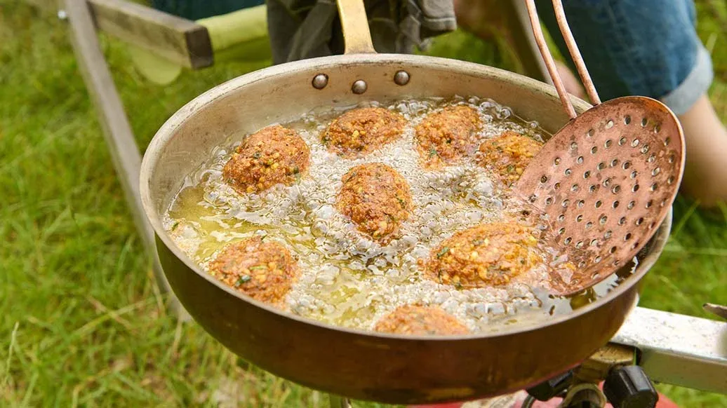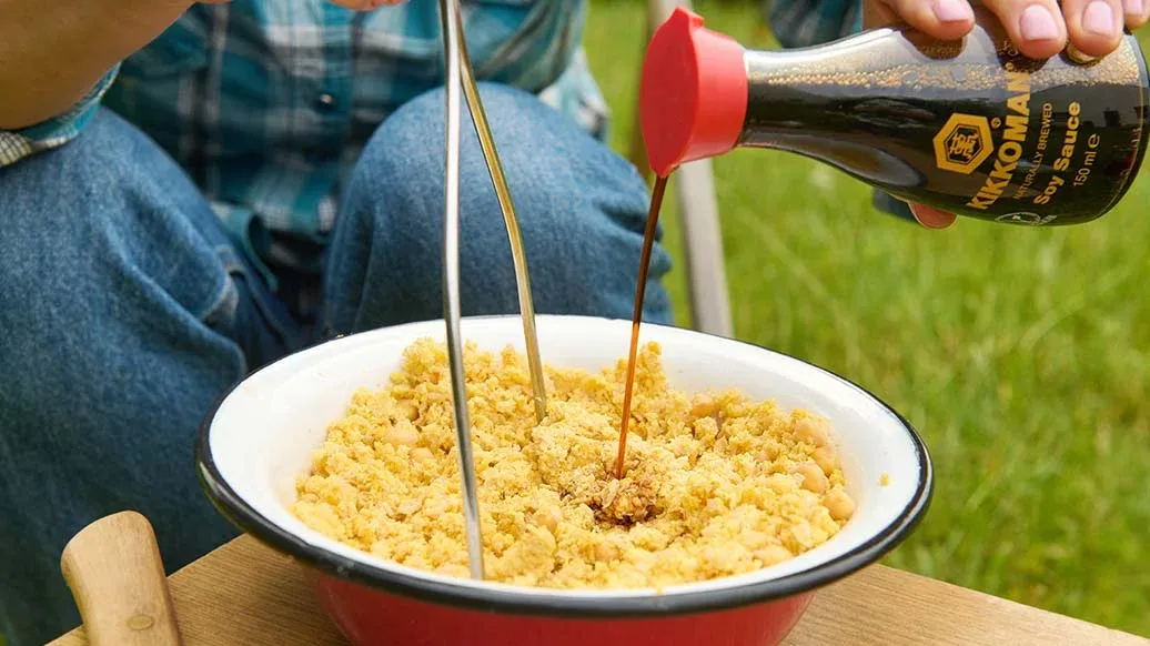 Nakrájejte cibuli. Přidejte ji do mixéru spolu s cizrnou (alternativně můžete směs rozdrtit mlýnkem nebo rozdrtit šťouchadlem na brambory). Když je směs rozemletá, přidejte koření, Kikkoman Sójovou omáčku, jedlou sodu a bylinky a vše promíchejte. Ze směsi vytvarujte placičky.