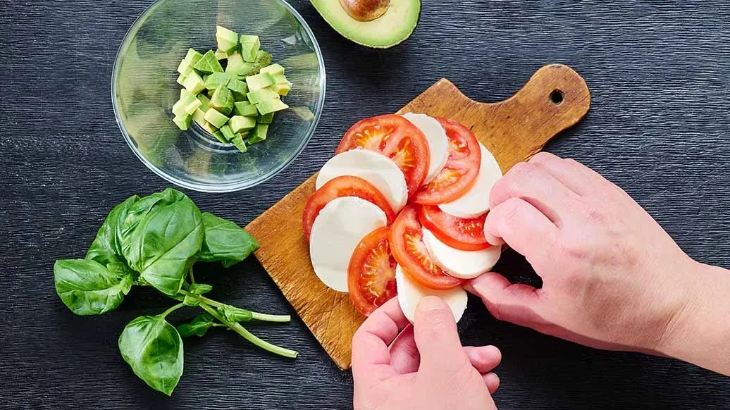 Rajčata a mozzarellu nakrájejte na stejně silné plátky (0,5–1 cm) a naaranžujte do kruhu na dva talíře. Bazalku nasekejte a posypte jí rajčata a mozzarellu. Avokádo nakrájejte na kostičky a odložte stranou.
