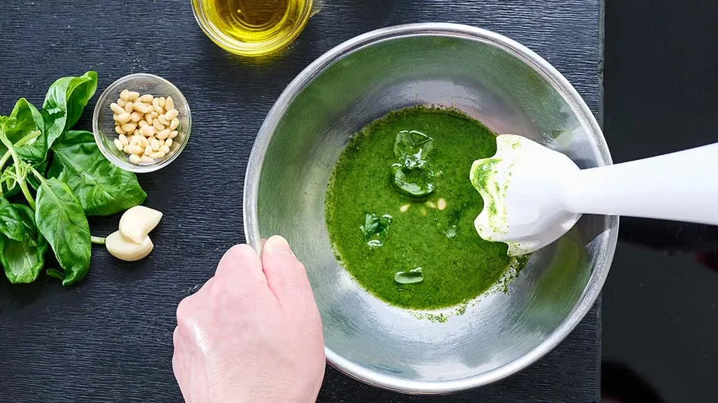Bazalku nasekejte a rozmixujte s oloupaným česnekem, olivovým olejem a piniovými oříšky dohladka.