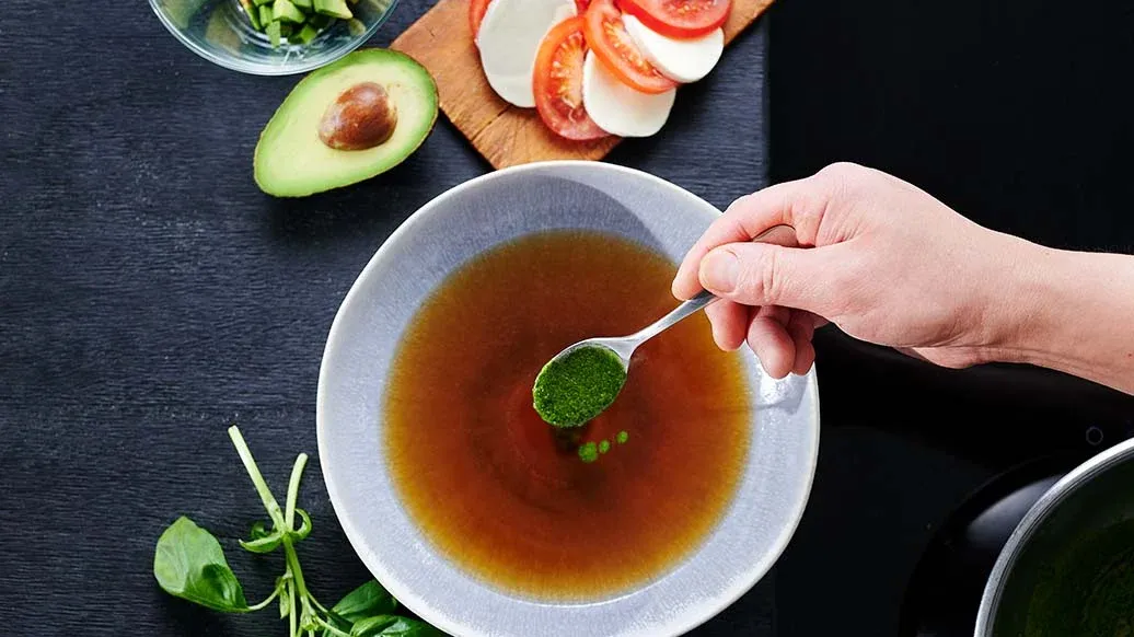 Do polévky přidejte nudle a opatrně pomocí lžíce nebo stěrky navršte rajčata a mozzarellu, aby se nerozpadly. Posypte avokádem a ořechy, poté ozdobte Kikkoman Sójovou omáčkou, černým pepřem a olivovým olejem.