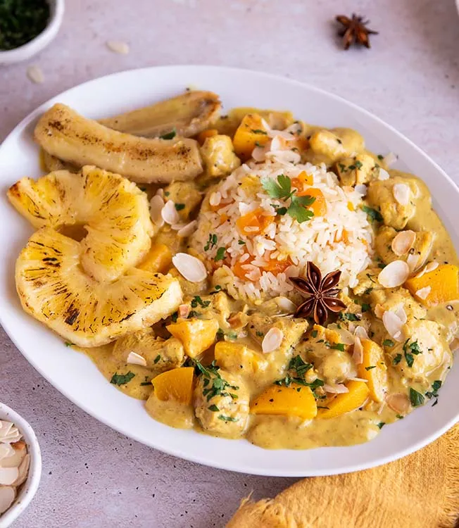 Na oleji orestujte šalotku a zázvor. Přidejte kuřecí maso a kari koření a opékejte, dokud není maso zcela propečené. Kuře vyjměte z pánve a odložte stranou. Ve stejné pánvi rozpusťte máslo, zaprašte moukou a krátce promíchejte. Přilijte vývar, smetanu, broskvový sirup a Sójovou omáčku Kikkoman. Za stálého míchání krátce povařte, dokud omáčka nezhoustne. Ochuťte pepřem, přidejte zpět kuře a broskve a vše důkladně prohřejte. Podávejte s rýží a opečeným ovocem, na závěr posypte mandlovými lupínky a petrželí.