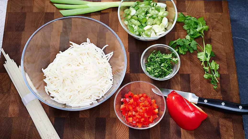 Uvařte nudle podle návodu a nakrájejte je na malé kusy. Jarní cibulku nakrájejte, koriandr posekejte, papriku nakrájejte na kostičky.