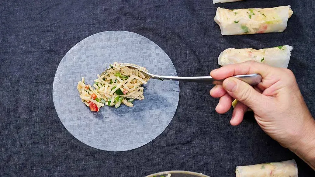 Každý rýžový papír krátce namočte do studené vody, položte na vlhkou utěrku, dejte lžíci náplně, přeložte okraje a srolujte.