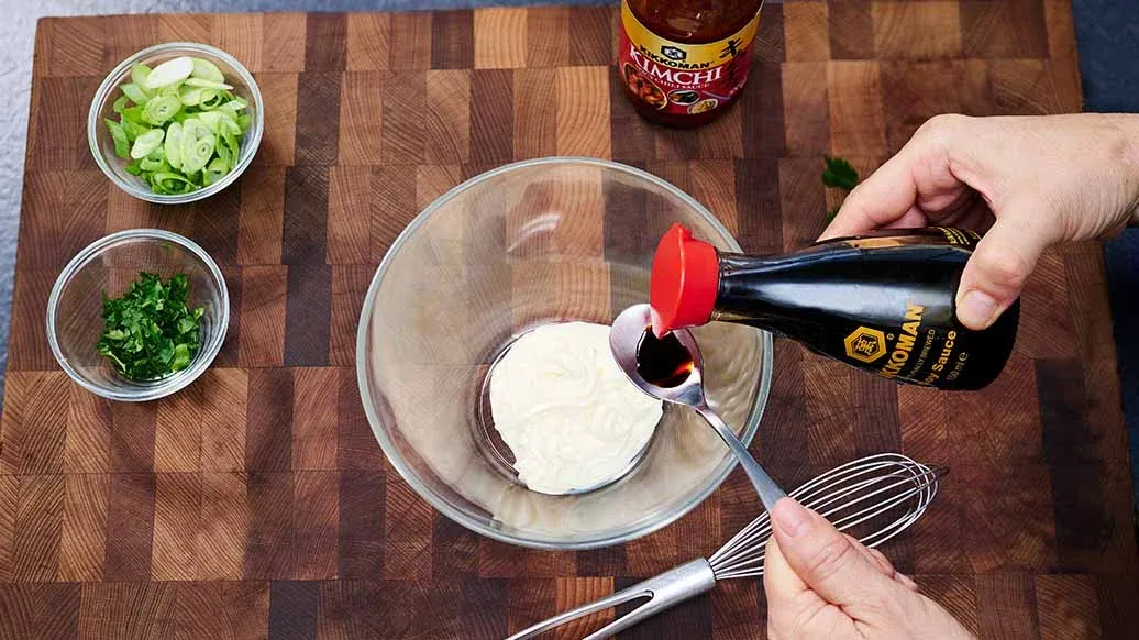 4 ½ polévkové lžíce majonézy – 1 čajová lžička Kikkoman Kimchi pikantní chili omáčka – 2 čajové lžičky Kikkoman Sójová omáčka přirozeně fermentovaná tekuté ochucovadlo – 1 snítka koriandru – 1 jarní cibulka