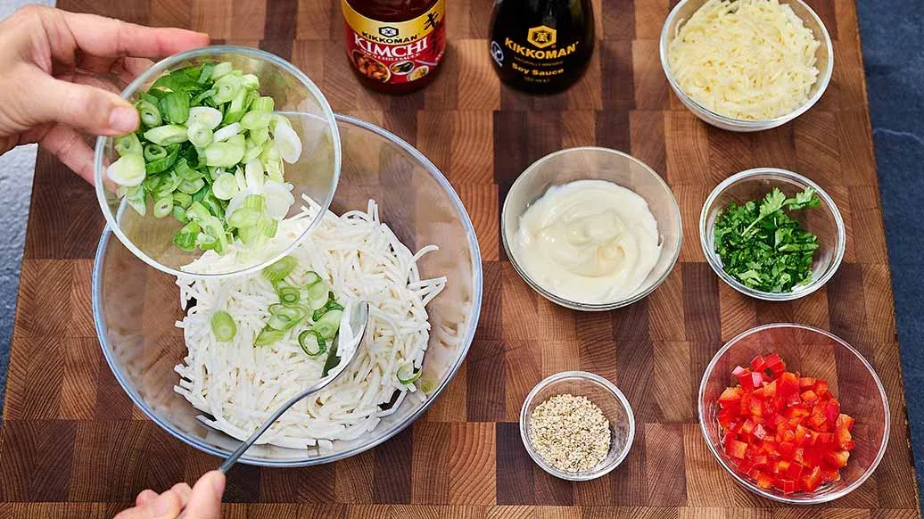 Smíchejte nudle se dvěma třetinami jarní cibulky, koriandrem, paprikou, sezamem, omáčkou Kikkoman Kimchi Chili , majonézou, sýrem a Kikkoman Sójovou omáčkou.