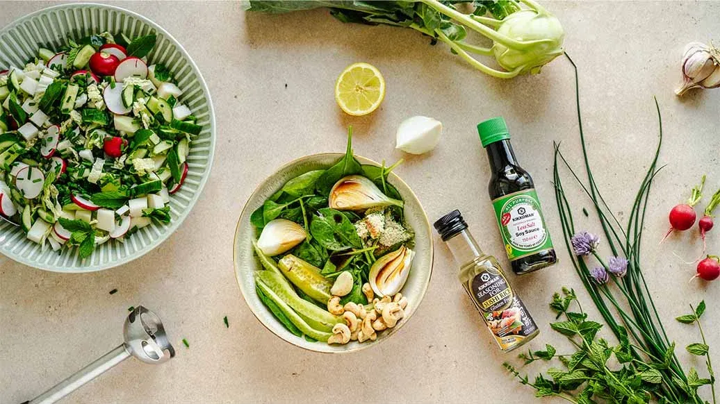 Špenát, cibuli, česnek a odložená okurková semínka rozmixujte do hladké omáčky spolu s olivovým olejem, sójovou omáčkou Kikkoman se sníženým obsahem soli, Kikkoman dochucovadlem na sushi rýži, citronovou šťávou, lahůdkovými kvasnicemi a kešu oříšky. Dresinkem přelijte zeleninu a důkladně promíchejte.