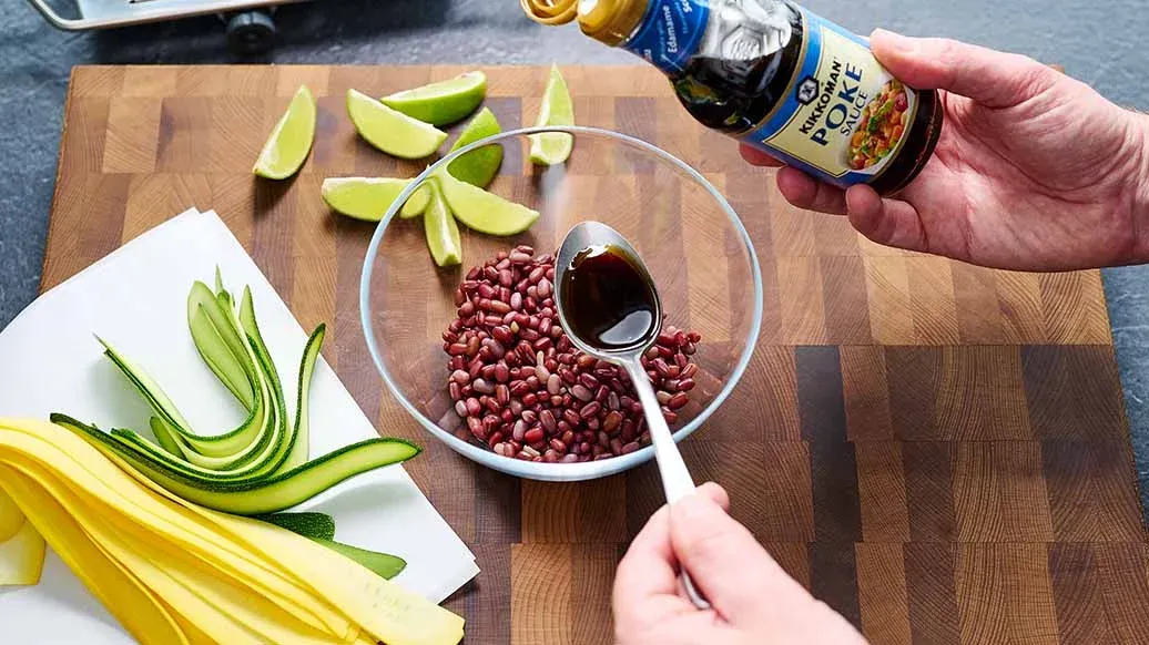 Cuketu nakrájejte podélně na plátky nebo proužky. Fazole azuki naložte do Kikkoman Poke Sauce. Limetku nakrájejte na osminky.