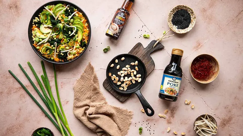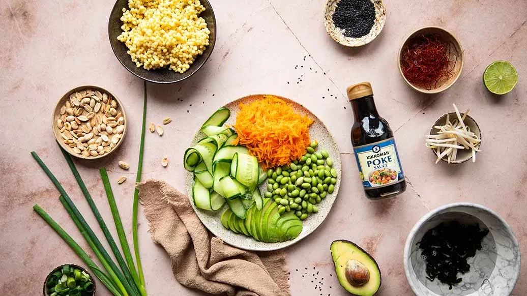 Šťavnatá zelenina, krémové avokádo, edamame a jemné mořské řasy wakame s kuskusem v lehkém medovo-limetkovém dresinku z Kikkoman Poke omáčky. Arašídy, klíčky a černý sezam dodávají tomuto osvěžujícímu salátu výraznou chuť a extra křupavost.