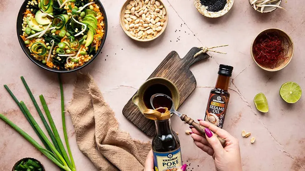 2 polévkové lžíce Kikkoman Poke omáčka – ½ polévková lžíce limetkové šťávy – 1 polévková lžíce Kikkoman Pražený sezamový olej – 1 čajová lžička medu