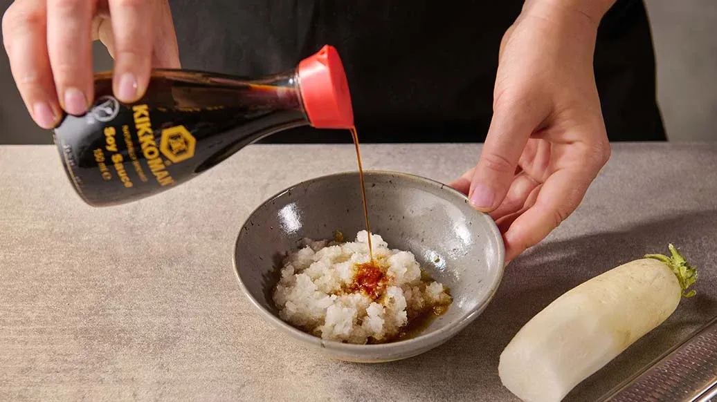Ředkev nastrouhejte najemno a smíchejte s Kikkoman Sójovou omáčkou. Jarní cibulku nasekejte. Vývar dejte na stůl, přílohy naservírujte zvlášť. Hovězí plátky namáčejte ve vývaru 10–15 sekund a podávejte s omáčkou.