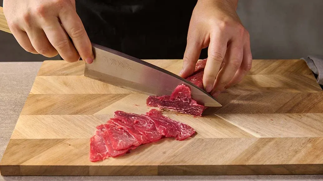 Maso dejte na 40–50 minut do mrazáku. Poté nakrájejte na tenké plátky.