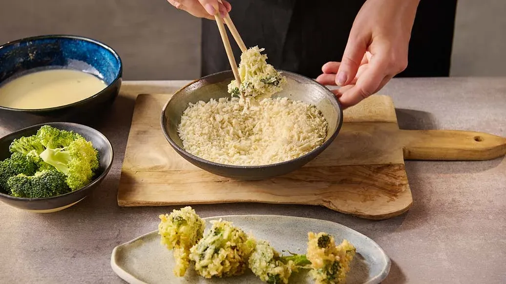 Brokolici očistěte a rozdělte na malé růžičky. Vodu smíchejte s tempura moukou, brokolici obalte v těstíčku a poté v Kikkoman Panko strouhance. Smažte dozlatova 3–5 minut.