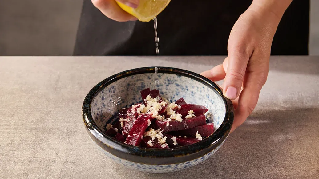 80 g vařené řepy – 1 čajová lžička Kikkoman Pražený sezamový olej – 10 g nakládaného zázvoru – 20 ml citronové šťávy