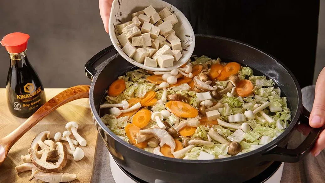 1 l dashi – 80 g mrkve – 80 g čínského zelí – 80 g shimeji – 50 g shiitake – 90 g tofu – 40 ml Kikkoman Sójová omáčka přirozeně fermentovaná tekuté ochucovadlo