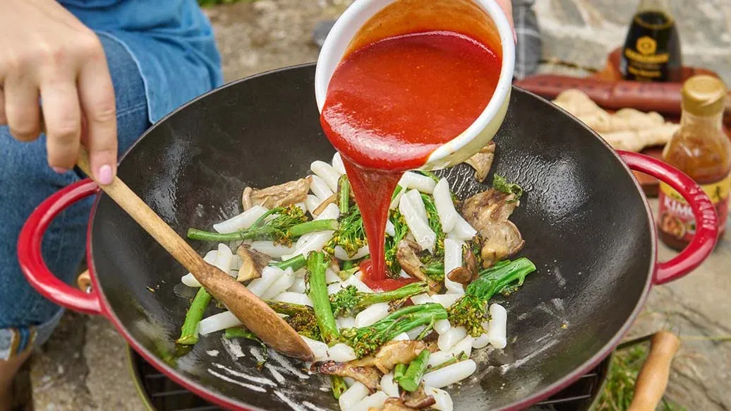 Dejte uvařené tteokbokki na pánev, zalijte omáčkou a dobře promíchejte, aby se rýžové koláčky krásně obalily a nasákly chutě.