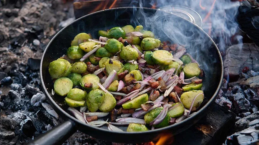 Na velké pánvi rozehřejte olej na vysokou teplotu. Přidejte nakrájené guanciale a restujte 3–4 minuty, dokud nebude křupavé. Přidejte růžičkovou kapustu a nasekanou šalotku a smažte 7–8 minut, dokud nezačne hnědnout a měknout.