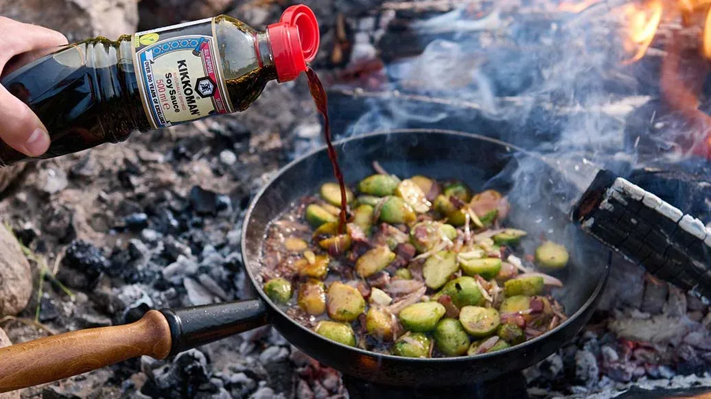 Do pánve přidejte Kikkoman Sójovou omáčku, Kikkoman Teriyaki BBQ omáčku s medem a na kostičky nakrájený česnek. Vařte další 1 až 2 minuty, dokud se nevytvoří jemná omáčka, která obalí všechny kapustičky. Přendejte směs na talíř.