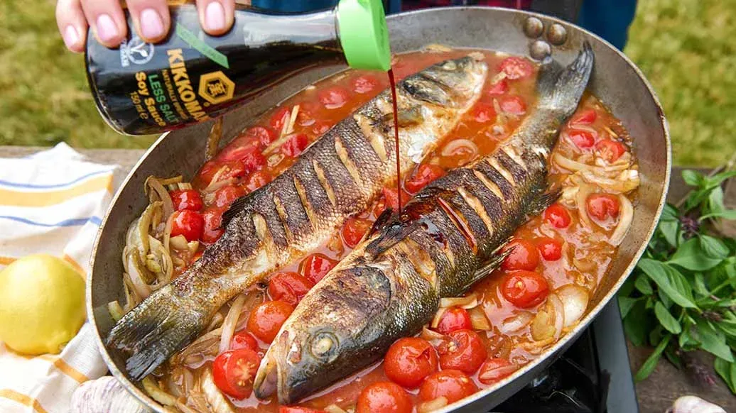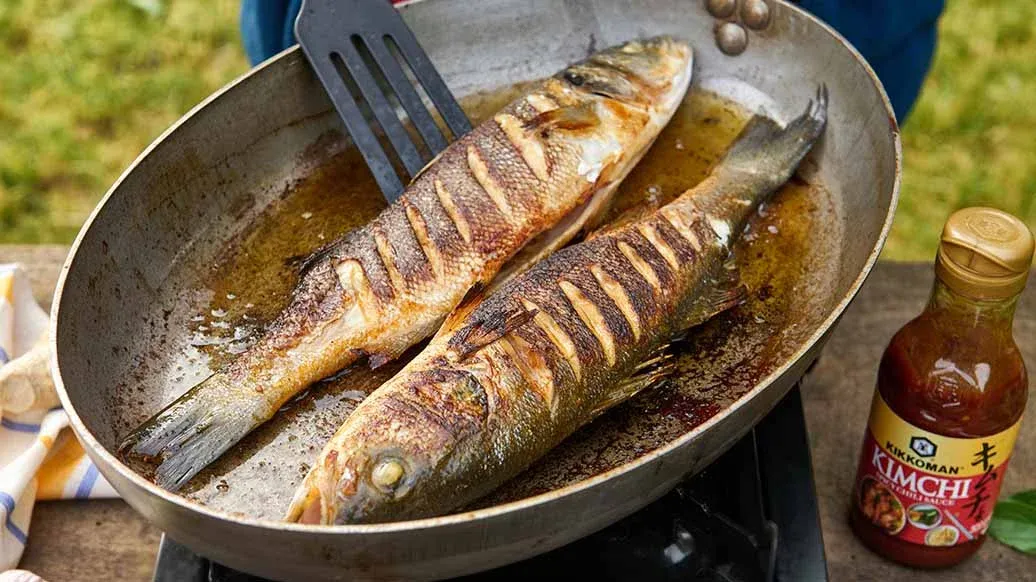 2 mořští vlci, každý o hmotnosti přibližně 350 g – 3 polévkové lžíce Kikkoman Kimchi pikantní chili omáčka