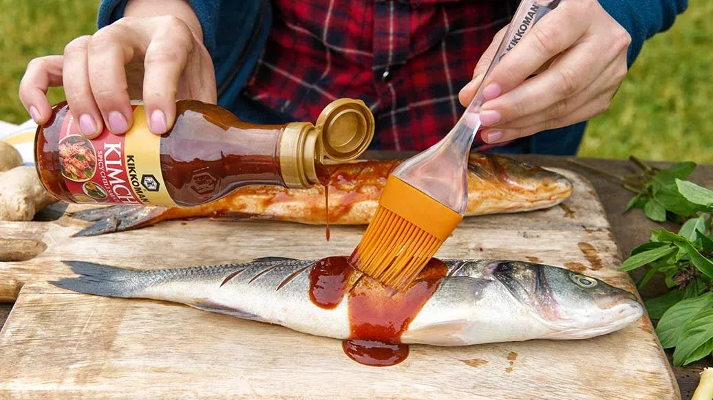 Odstraňte šupiny z ryby, rybu omyjte a osušte. Nařízněte kůži ryb na obou stranách nožem. Rybu potřete Kikkoman Kimchi Chili omáčkou a nechte odstát stranou.